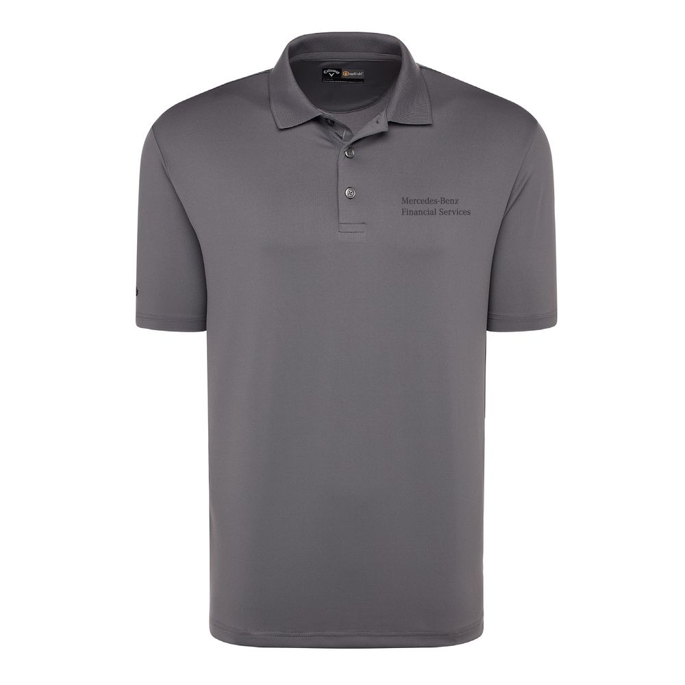 sku: CGM5505.3 oz 95% polyester/ 5% spandex jersey knit fabric. Opti-Dri technology transfers moisture away from the body to keep you cool and dry. UV Repel technology keeps skin safe from the sun's harmful rays. UPF 50. Stretch fabric moves with you to increase your range of motion. Rib knit collar. 3-button placket with Callaway embossed buttons. Double needle hemmed bottom with side vents. Heat seal label provides tag-free comfort. Tonal embroidered Chevron inside placket. Embossed Chevron on back neck. Contrast embroidered Callaway logo on right sleeve.